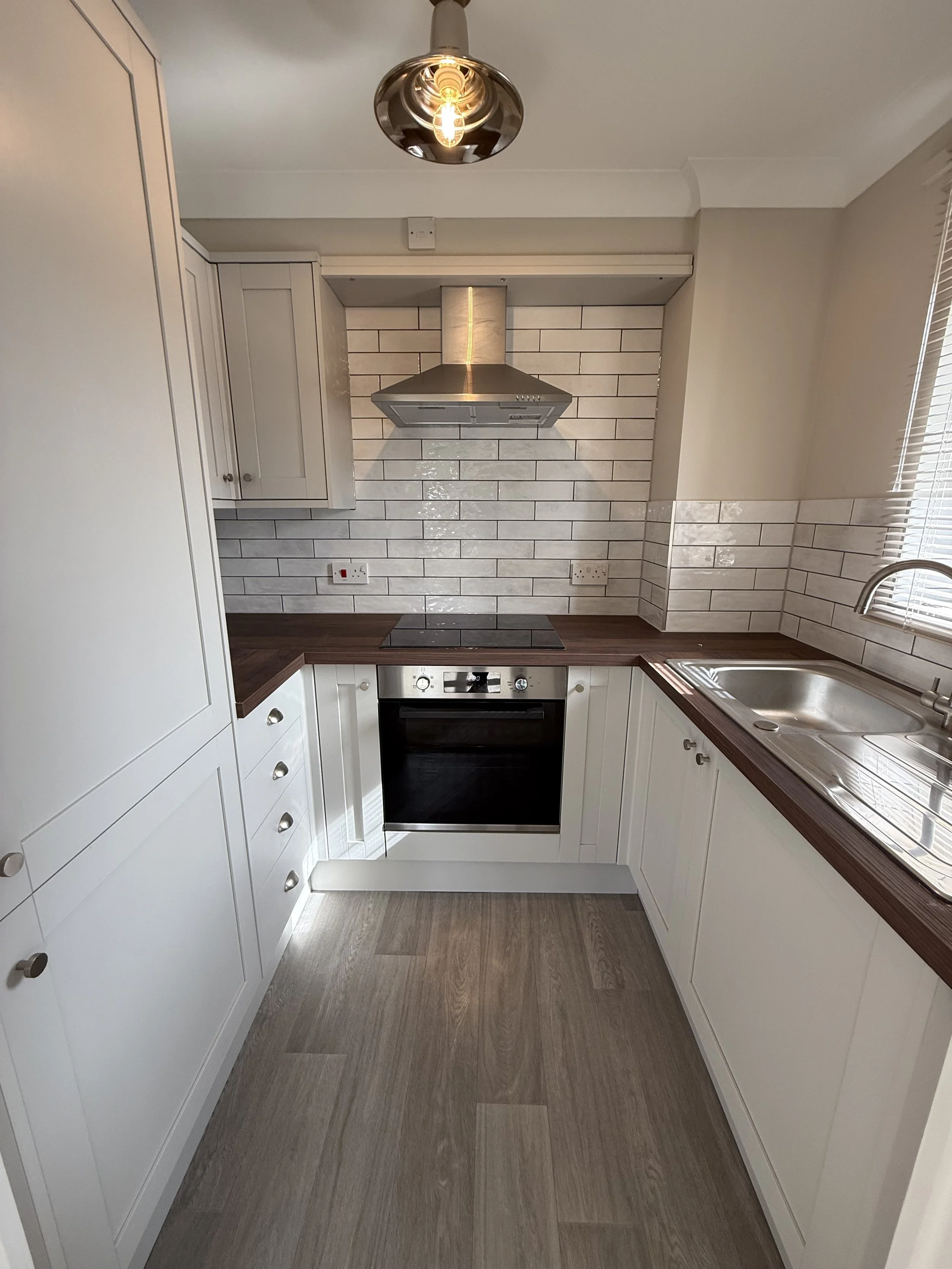 Shaker-style, U-shaped kitchen with walnut-tone tops, metro tiles, and new hob/oven/extractor.